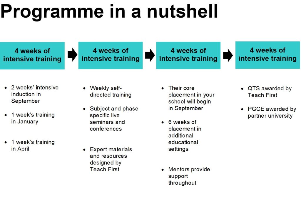 At the start of the programme in September, you’ll have two weeks of intensive training which will focus on the core areas of teaching such as behaviour management and lesson planning. You will have a further two separate weeks of intensive training later in the year.